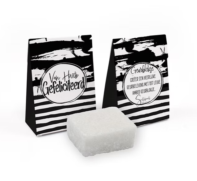 Een cadeautje krijgen is leuk, maar een cadeautje geven is eigenlijk veel leuker! Want hoe leuk is het om iemand blij te maken met een origineel cadeau voor welke gelegenheid dan ook? Dit leuke kleine cadeautje is er ook zo één om weg te geven. In dit doosje zit een heerlijk ruikend wit amberblokje. De geur van een amberblokje blijf je minimaal één jaar ruiken. Hang het in een organza zakje in de kledingkast, leg het op een schaaltje of hang het in de auto. Mocht de geur iets minder worden, dan schraap je er iets vanaf en het ruikt het weer heerlijk. Het schaafsel kan zelfs ook nog gebruikt worden in de stofzuigerzak.