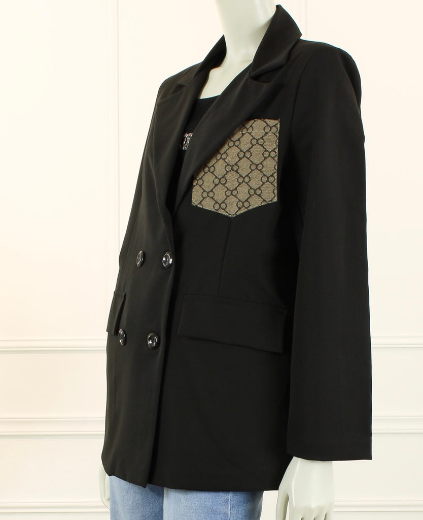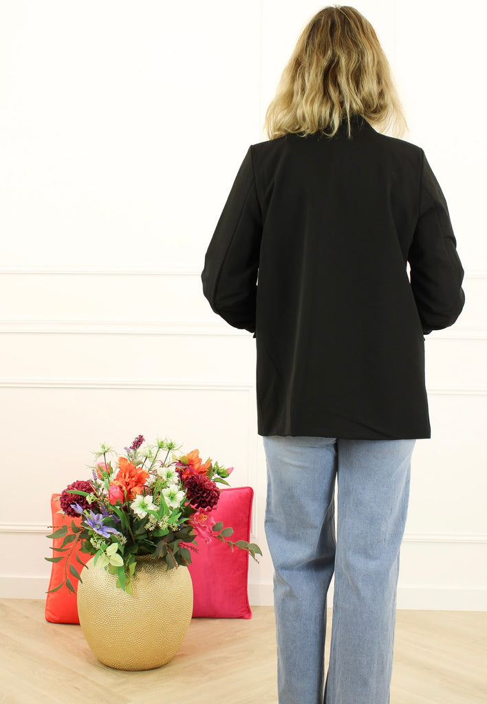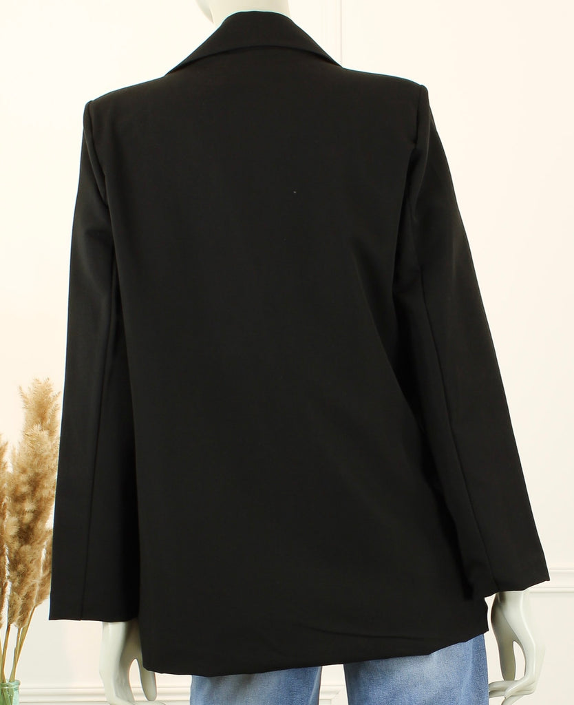 Super mooie oversized blazer met een tof designers printje. Heel goed te combineren met blousjes, basic truitjes en diverse kleuren broeken of rokken. De blazer heeft een sportief oversized model.