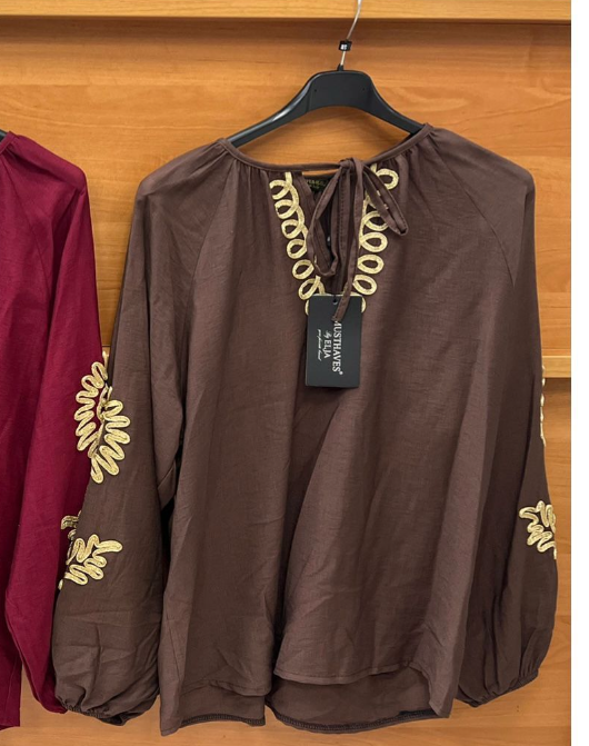 Deze prachtige blouse heeft gave goud geborduurde swirls op de mouw. De blouse heeft een ronde hals die sluit met een koordje. De mouwen hebben een elastiekje waardoor ze ook op te halen zijn.