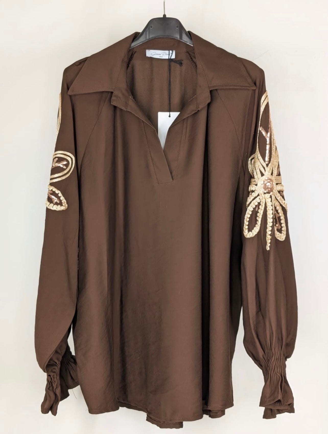 Deze prachtige blouse heeft gave goud geborduurde bloemen op de mouw. De blouse heeft leuke ruffle mouwtjes.