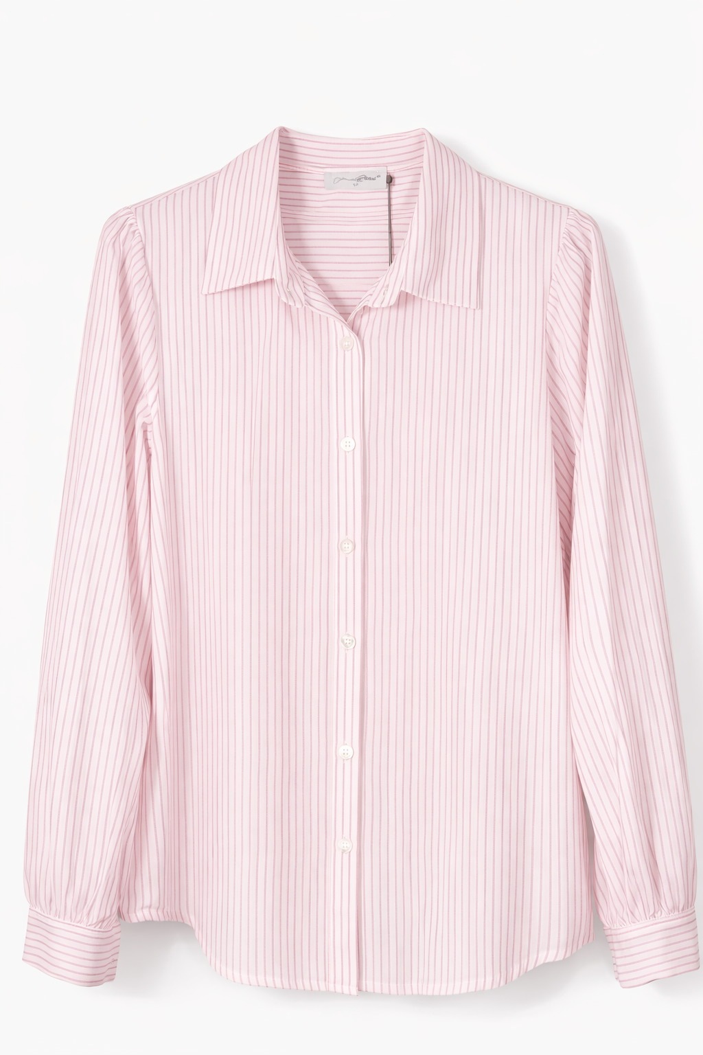 Wat een leukerd is dit! de blouse heeft een mooi streepje met een subtiel glittertje erin waardoor hij een luxe uitstraling heeft! De blouse is een doorknoopmodel en gemaakt van een dunnere, luchtige stof. leuk te combineren met een jasje, gilet of vest maar ook prima door te dragen op zonnigere dagen!