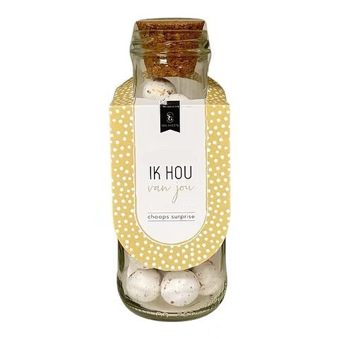 Maak kennis met ons nieuwste en meest verrassende cadeau! Een stijlvolle glazen fles met kurk, gevuld met de fijnste Belgische chocolade choco's choops (een luchtig krokant koekje, perfect omhuld met melkchocolade en afgewerkt met een delicaat suikerlaagje).