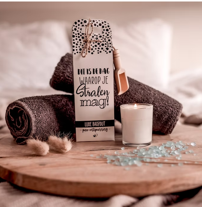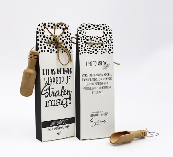 Met dit originele cadeau kun jij jouw juf, een vriendin, je moeder, je buurvrouw of iemand anders die je lief vindt bedanken. Onze luxe badzout is heerlijk voor een relax momentje met pure ontspanning. Alle verpakkingen zijn voor elke gelegenheid ontworpen met lieve, leuke en warme teksten. Daarnaast is het mooi gepresenteerd in een hippe zwarte witte verpakking. Het zakje badzout bestaat uit een groffe korrel met een frisse verrassende geur. Eén lepel badzout is al genoeg voor een lekker voetenbadje. Wil je heerlijk relaxen in bad, gooi dan het hele zakje badzout in bad.