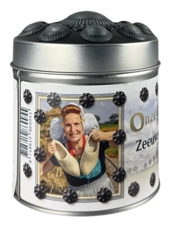 In dit mooie zilverkleurig blik zit 250 gram van de allerlekkerste Zeeuwse knopendrop. Het deksel van het blik is in de vorm van de Zeeuwse knoop. Het deksel van het blik is in de vorm van de Zeeuwse knoop. Het etiket is door de speciale lijm die is gebruikt eenvoudig te verwijderen zodat u een prachtig voorraadblik over houd.