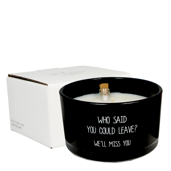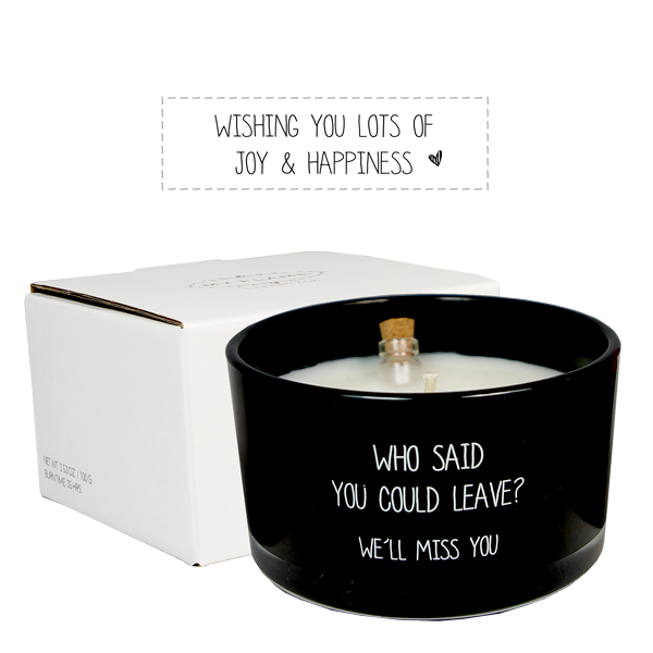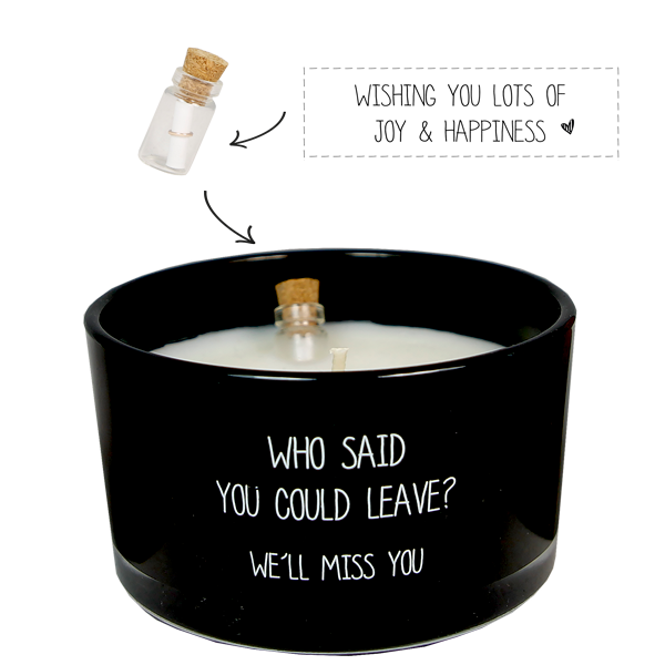 Op de geurkaars staat 'Who said you could leave? We'll miss you'. In de wax vind je een flesje met daarin een briefje. Voordat je de kaars brandt kan je het flesje uit de wax trekken, de kurk van het flesje en het briefje eruit halen. Op het briefje staat 'Wishing you lots of joy and happiness'. Een mooi cadeau met een leuk complimentje voor iemand die op reis gaat.