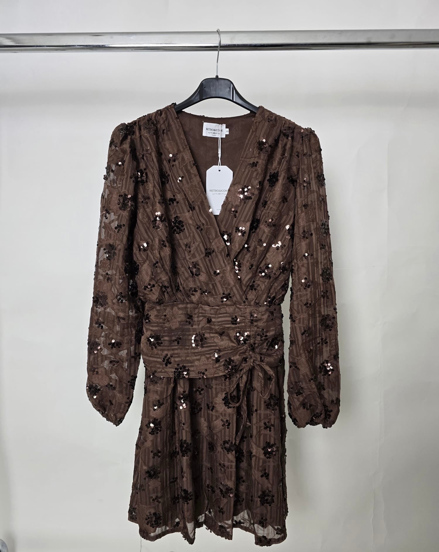 Wauw! Bij het zien van dit jurkje waren wij gelijk opslag verliefd! De prachtige bruine kleur in combinatie met de pailletten maken hem super stijlvol! Ideaal voor een chique etentje of een feestje.