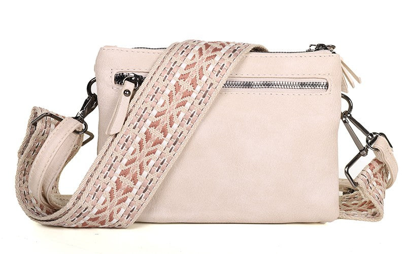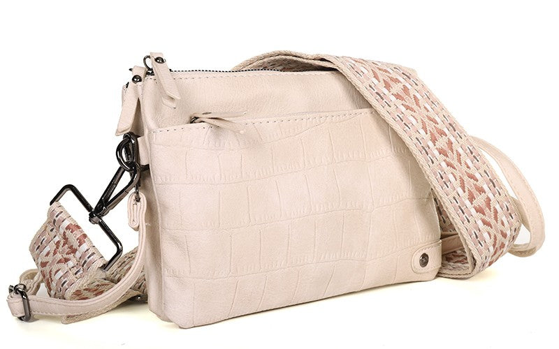 Aan de voorzijde zit een royaal vak waar je je Samsung of iphone telefoon in kwijt kunt. De voorkant is uitgevoerd in een natuurlijke croco print. De twee grote vakken zijn afsluitbaar met voor elk vak een aparte rits, het middenvak is daarnaast voorzien van insteekvakjes voor pasjes en afsluitbaar met een magneetsluiting. Ideaal voor je pasjes en papiergeld! Het tasje is uitgevoerd in hoogwaardig PU (kunstleer) materiaal. De schoudertas wordt geleverd met twee schouderbanden: een PU schouderband en een geweven brede schouderband. Je kunt dit tasje multifunctioneel gebruiken. Je kunt deze crossbody en over de schouder dragen dankzij de verstelbare schouderband.