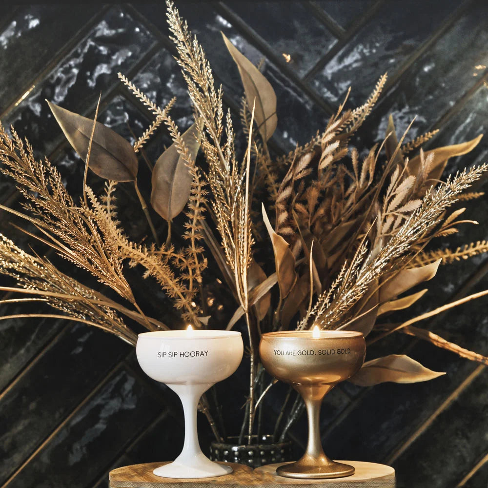 Te leuke geurkaars in een champagne coupe. De kaars is gemaakt van biologische sojawas en heeft de geur Fresh Cotton. Op de rand van het glas staat een toepasselijke tekst; Sip sip hooray. Een super leuk cadeau voor een verjaardag, als er iets te vieren is, of gewoon zomaar. De kaars brandt ca. 30 uur.