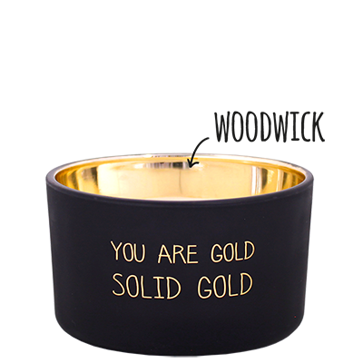 De buitenkant van het glas is mat met gouden letters. De binnenkant van het glas is metallic goud.