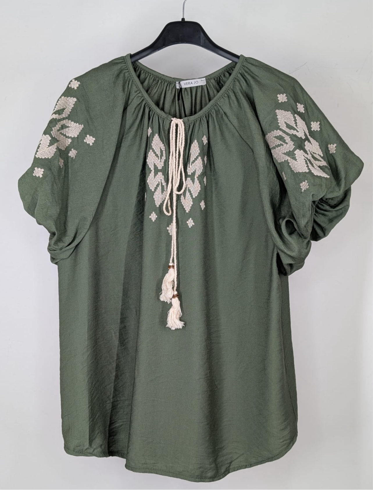 Deze super leuke top heeft niet alleen een leuk detail op de mouw, het koordje maakt hem ook helemaal af! Draagt super fijn door de luchtige stof.
