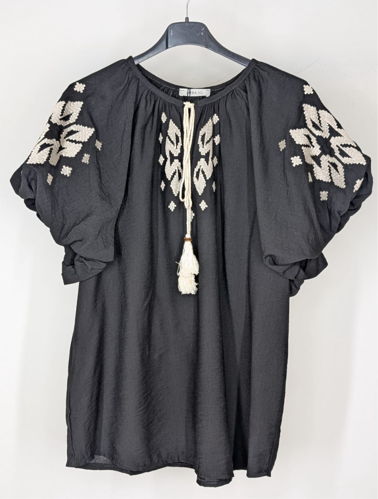Deze super leuke top heeft niet alleen een leuk detail op de mouw, het koordje maakt hem ook helemaal af! Draagt super fijn door de luchtige stof.