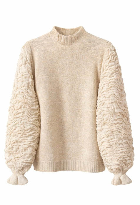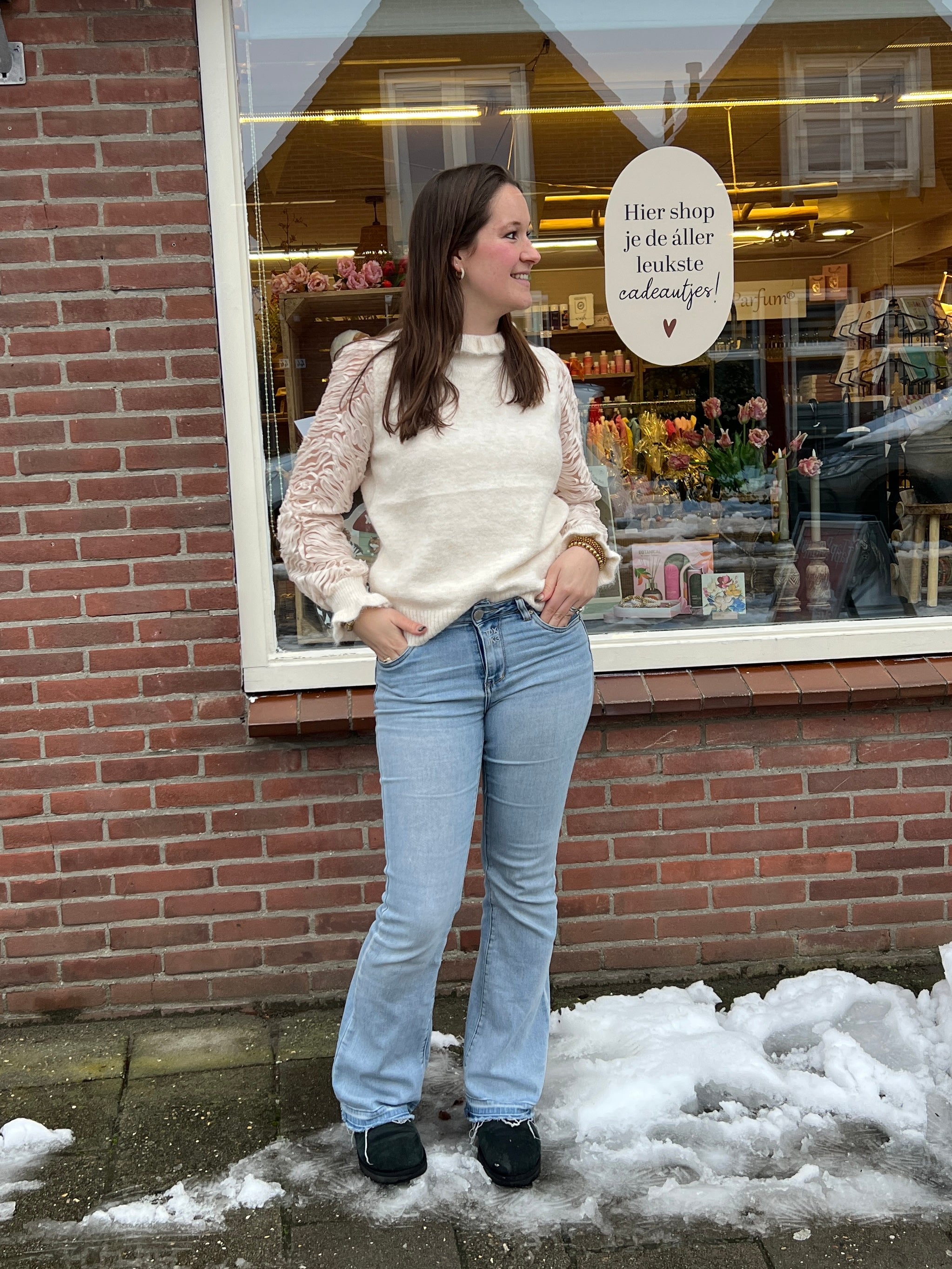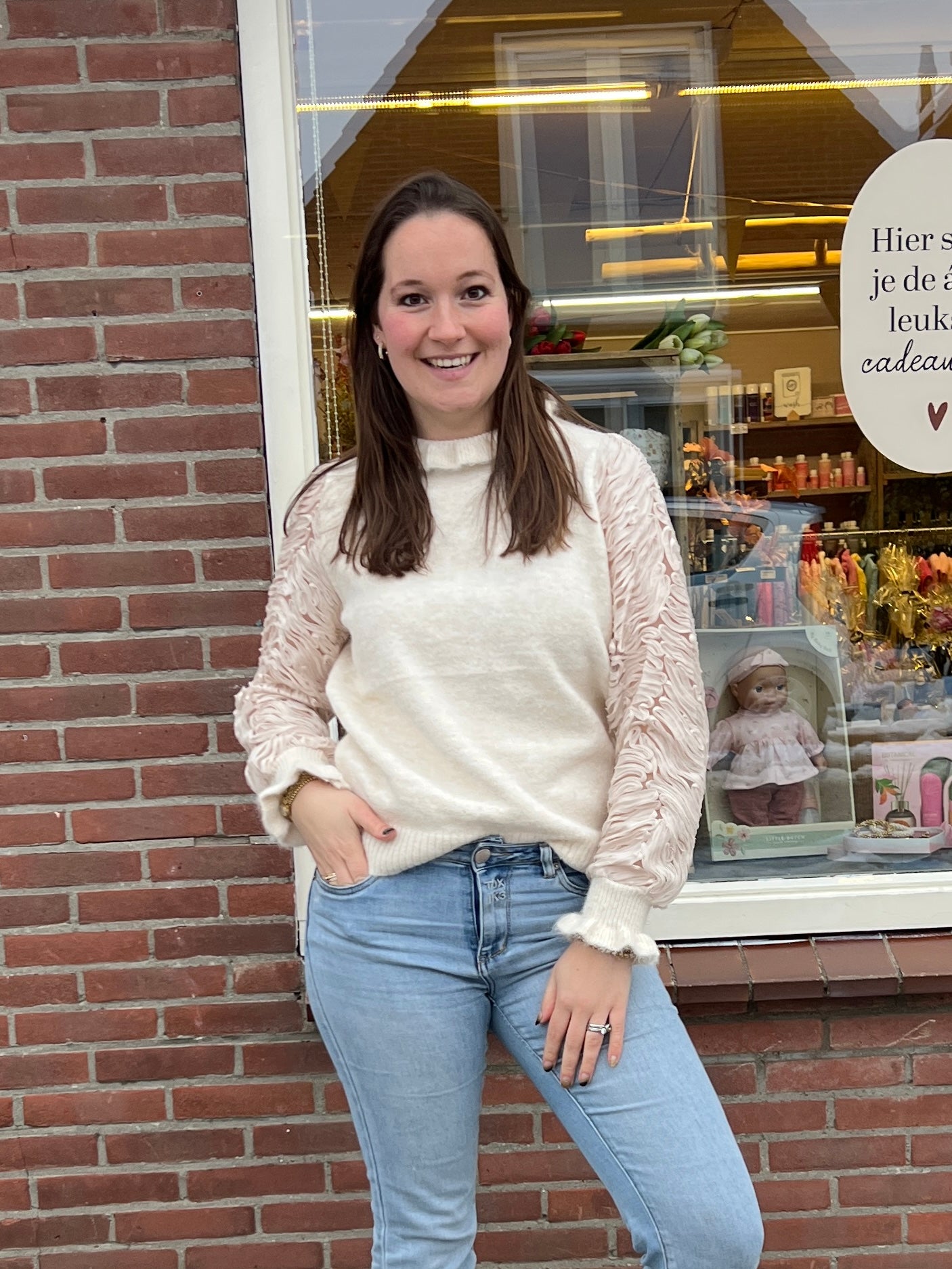 Wat een heerlijke trui is dit! Hij is lekker zacht en prikt niet. Hij heeft leuke ruffle randjes aan de mouwen en de hals. De mouwen maken hem extra leuk; ze zijn licht doorschijnend en hebben een leuk werkje erin.
