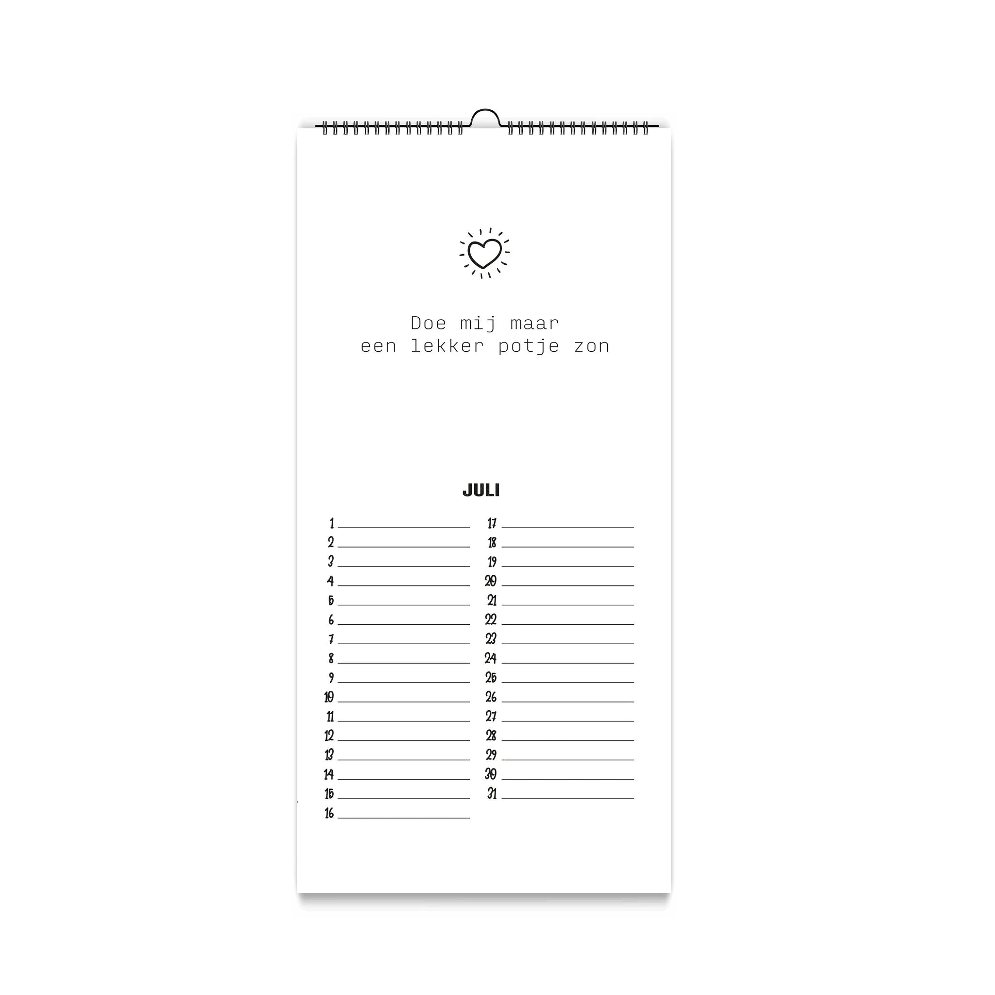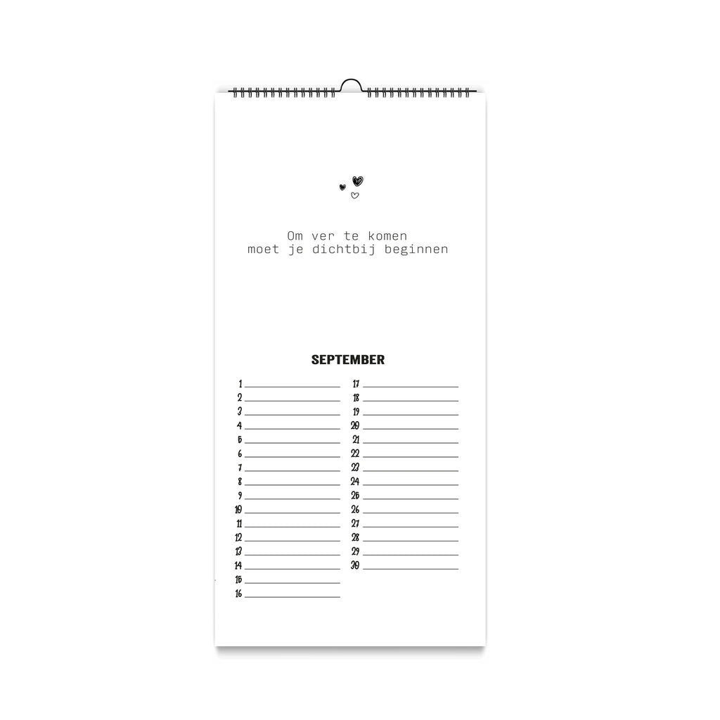 De kalender is wit met een zwarte wire-o binding met ophanghaakje.